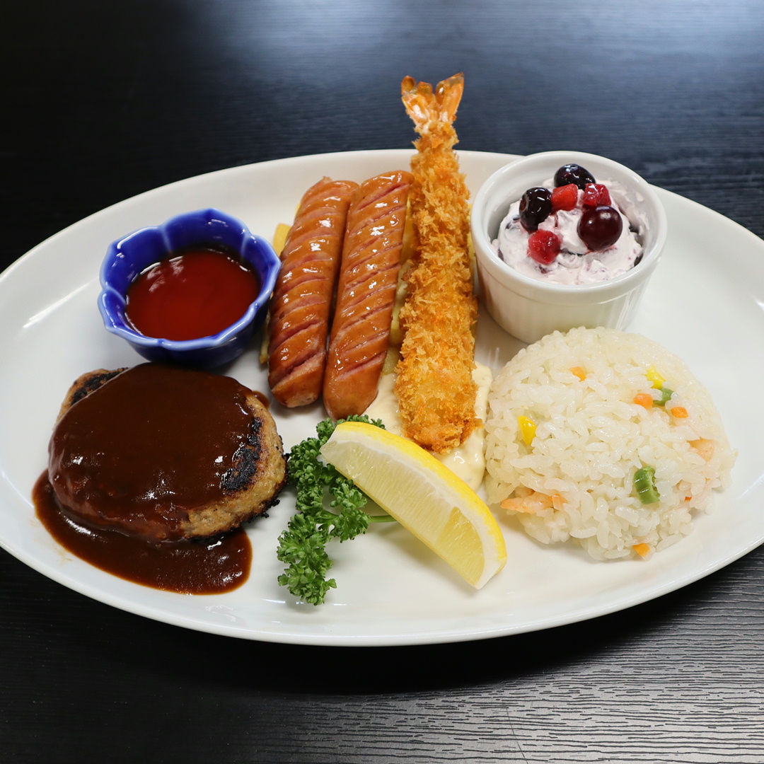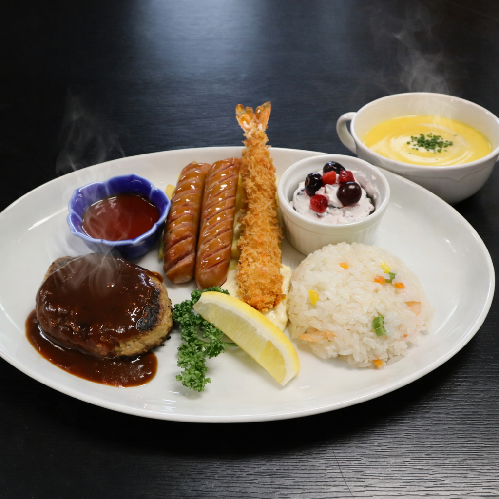 ふんわり卵料理にハムとパン、そしてフルーツを添えた定番の洋朝食。軽やかな朝にぴったりのセットです。(スープ&ドリンクバー付き)