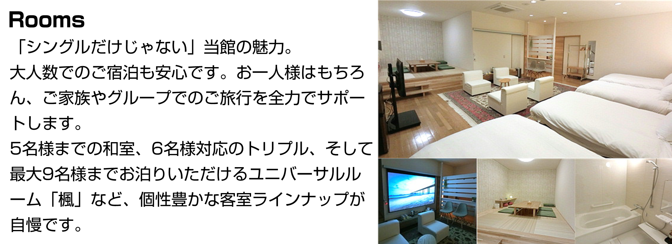 5名様までの和室、6名様対応のトリプル、そして最大9名様までお泊りいただけるユニバーサルルーム「楓」など、個性豊かな客室ラインナップが自慢です。